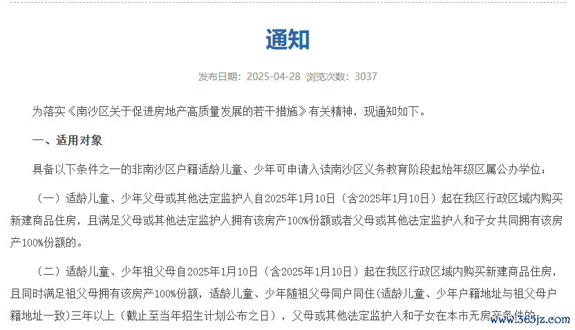 适龄儿童、少年祖父母自2025年1月10日(含2025年1月10日)起在南沙区行政区域内购买新建商品住房,且同时满足祖父母拥有该房产100%份额,适龄儿童、少年随祖父母同户同住(适龄儿童、少年户籍地址与祖父母户籍地址一致)三年以上(截止至当年招生计划公布之日),父母或其他法定监护人和子女在本市无房产条件的。